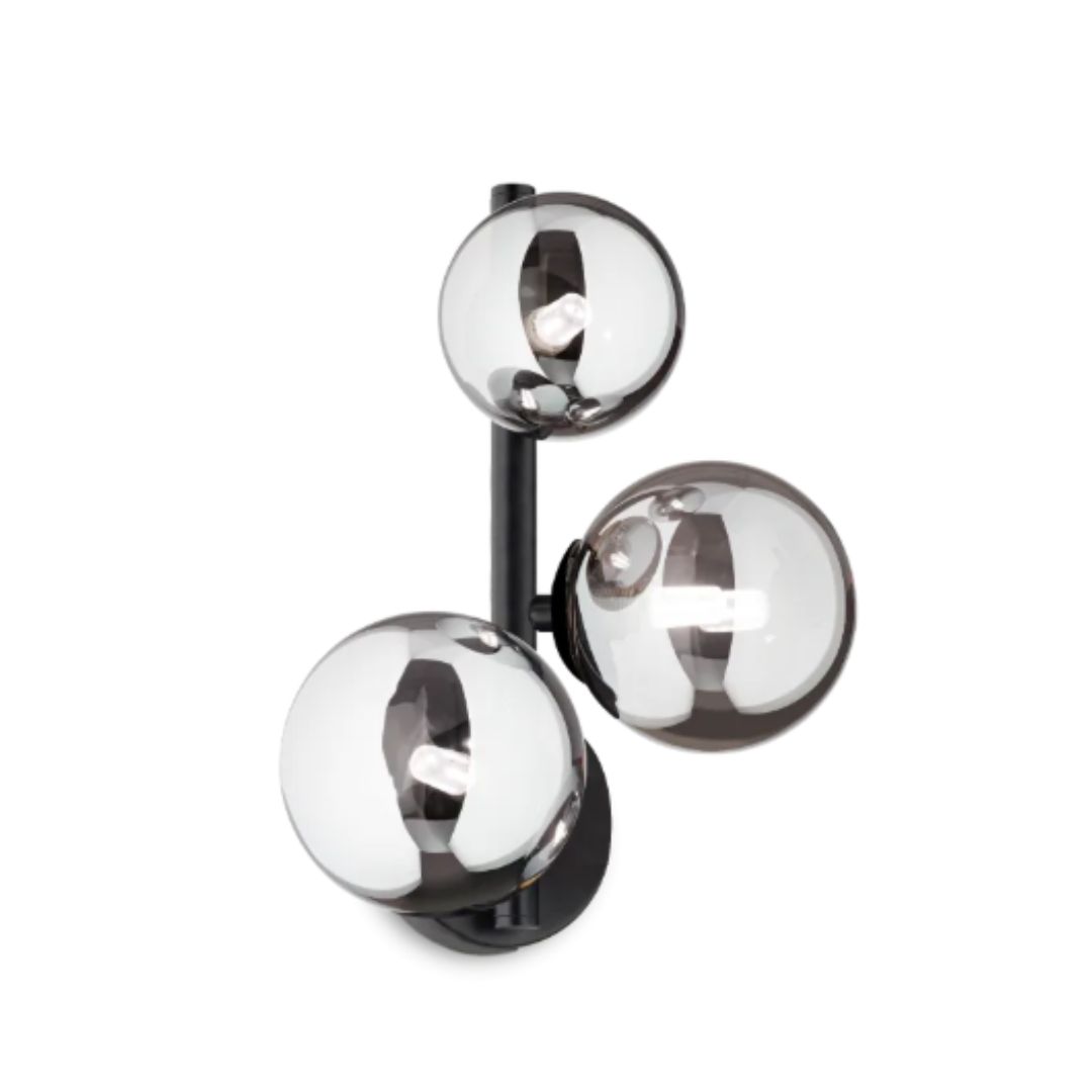 Aplica de perete modernă cu 3 becuri G9, montură metalică și difuzoare din sticlă ambră — Ideal Lux Perlage AP3 Ambra oferă iluminare ambientală elegantă și un design rafinat pentru living, dormitor sau hol.