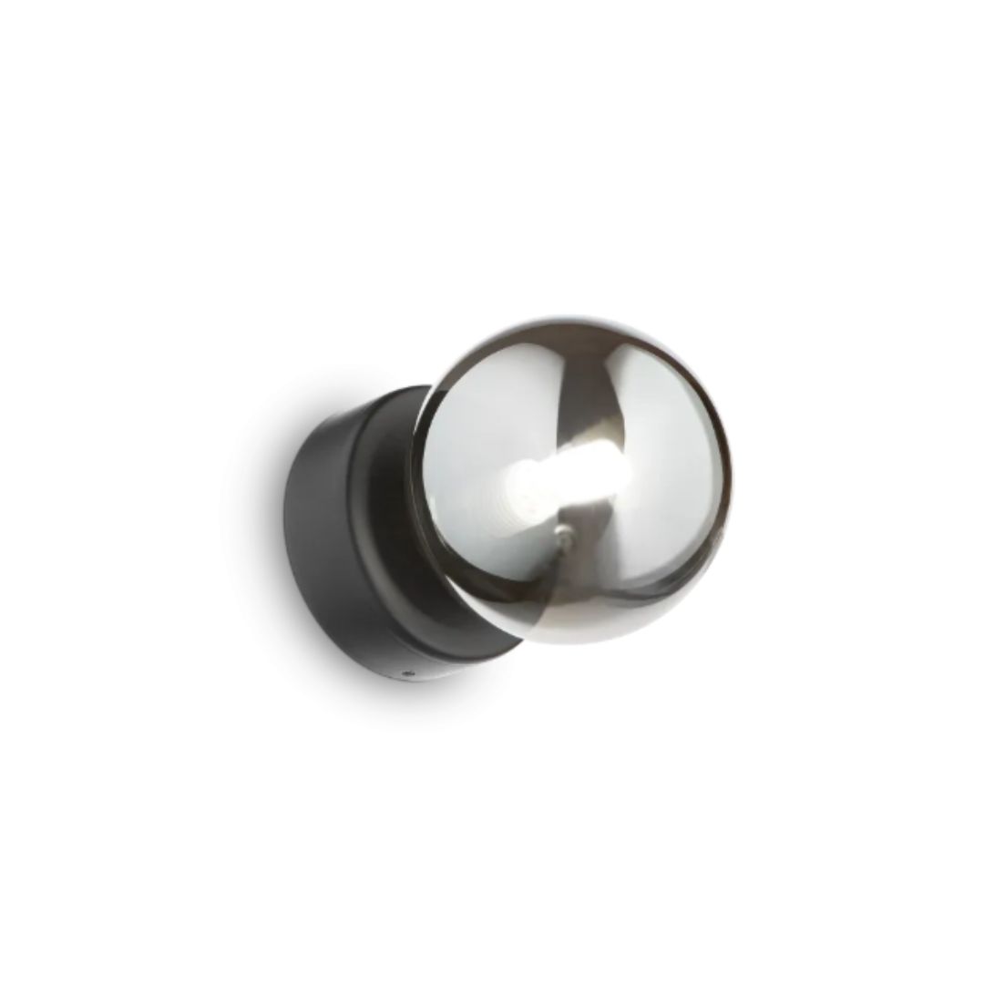 Aplica de perete compactă, modernă — Ideal Lux Perlage AP1, cu abajur sferic din sticlă și structură metalică, dimensiuni 10×10×13,3 cm, soclu G9, perfectă pentru living, hol sau dormitor.