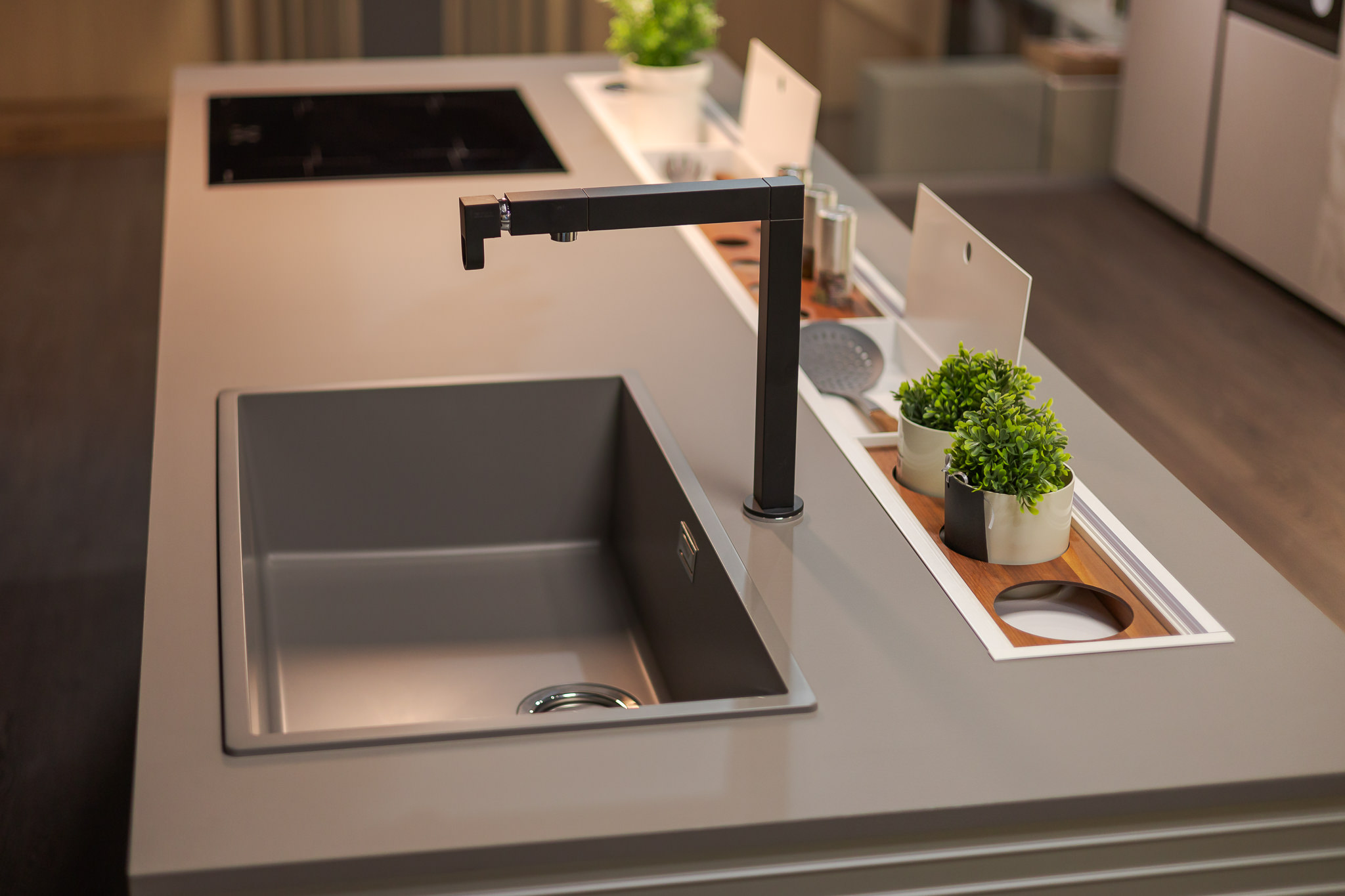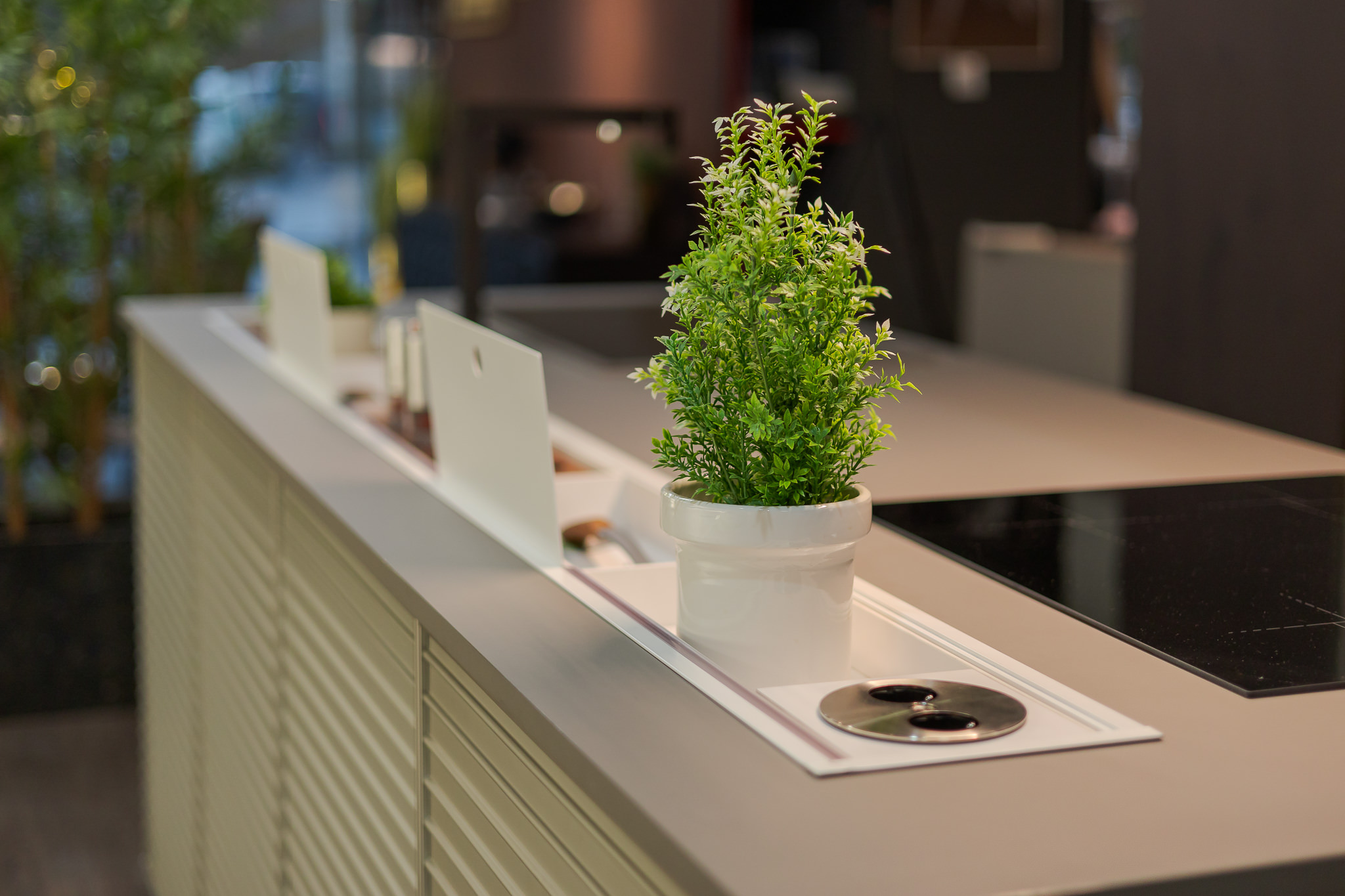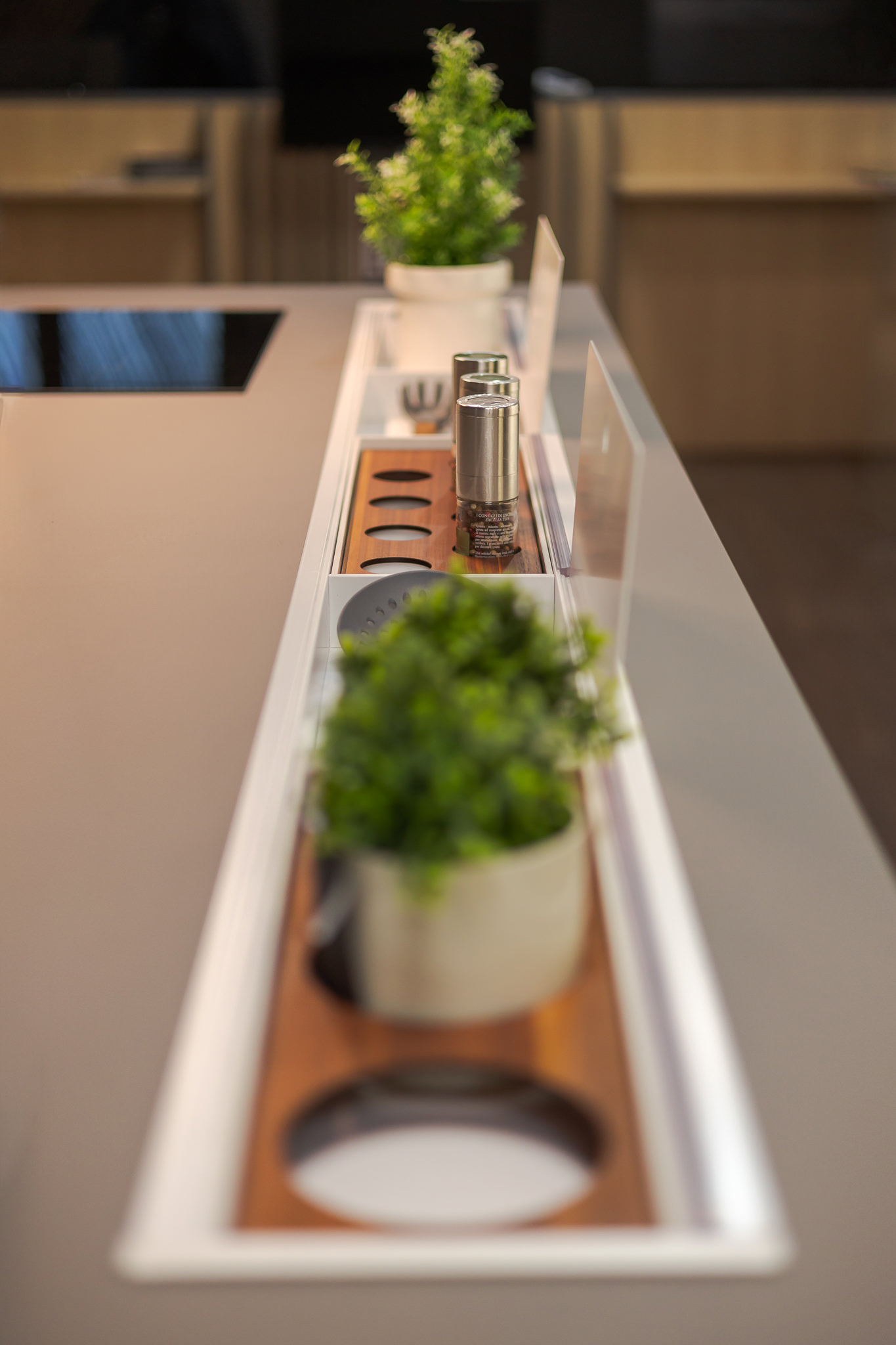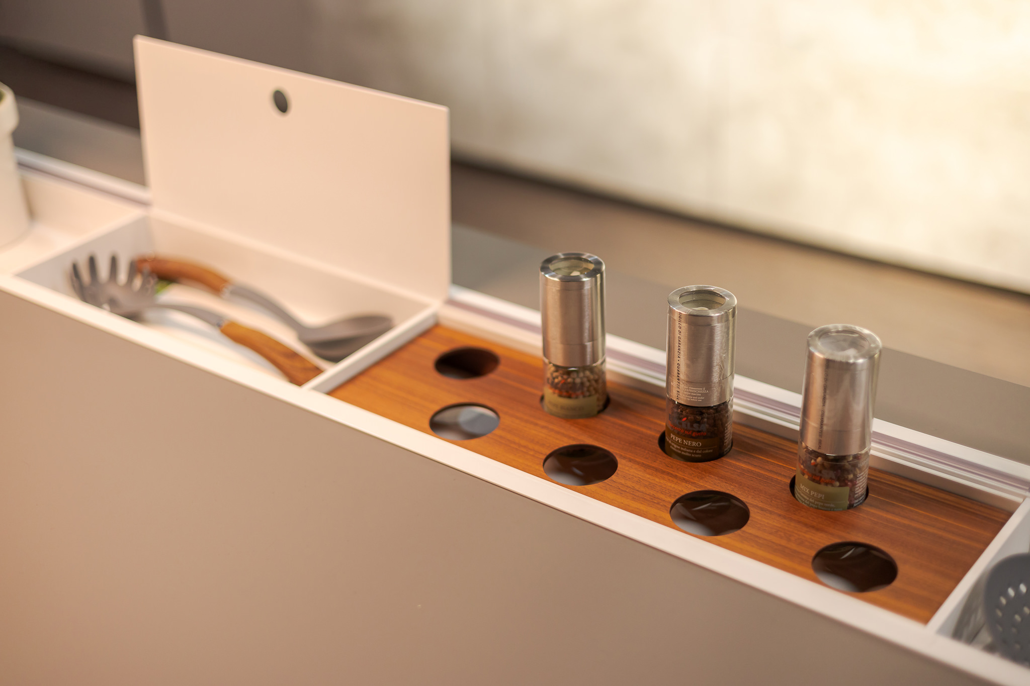 • Suport pentru accesorii și prize integrate în blatul insulei
