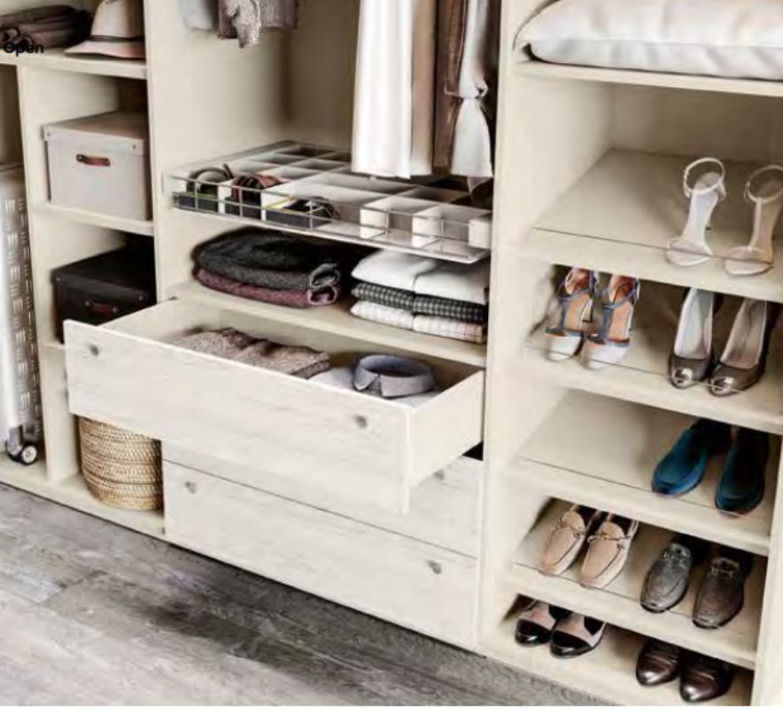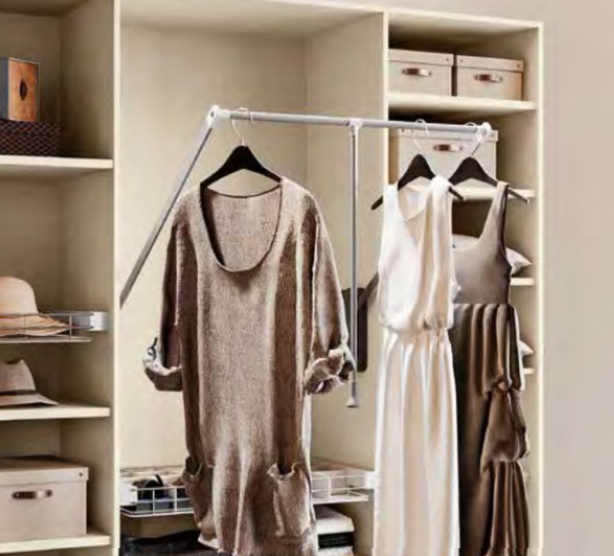 Compoziția cupinde polițe pentru haine impachetate si bară umerașe si rafturi laterale. La cerere se pot adăuga accesorii sau module suplimentare.