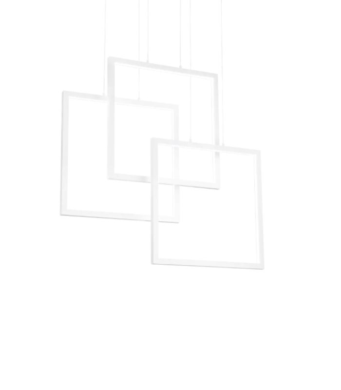 Suspensie modernă Ideal Lux Frame SP QUADRATO— 73 cm, adâncime 13 cm, structură metalică alb mat și difuzor opal; lumină directă, înălțime reglabilă 80–249 cm, ideală pentru living, dining sau bucătărie.