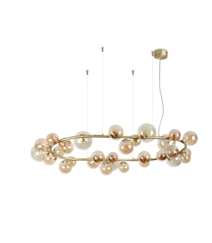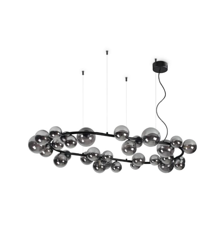 Ideal Lux Perlage SP30 Ambra este o lustră suspendată modernă, cu structură metalică și difuzoare din sticlă suflată, proiectată pentru spații interior-contemporane ce cer un impact vizual puternic. Designul combină elemente elegante — metal + sticlă fumurie/ambra — într-o formă impunătoare, ce devine punct focal al încăperii. Lampa are dimensiunile: lungime 143 cm × lățime 93 cm, iar înălțimea este reglabilă între 40 cm și 216,5 cm, oferind flexibilitate la montaj.