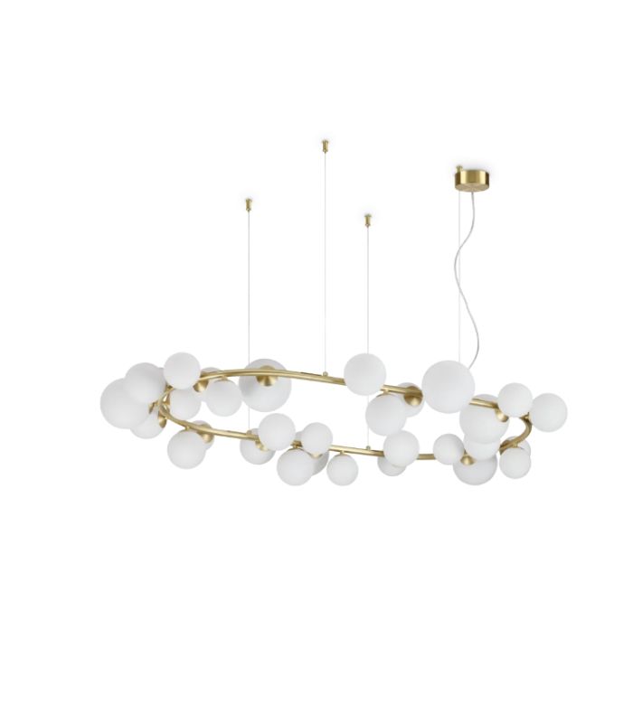 Suspensia este dotată cu 30 de puncte de lumină (soclu G9), fiecare cu putere maximă 15 W — astfel încât să ofere o iluminare intensă și uniformă, potrivită pentru livinguri generoase, dining, spații open-space sau zone cu tavan înalt.
