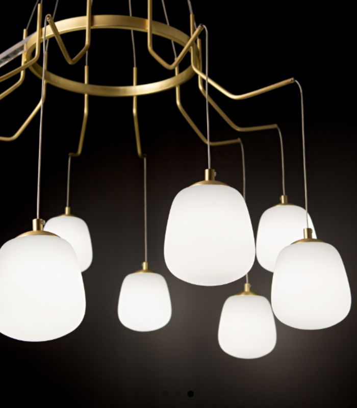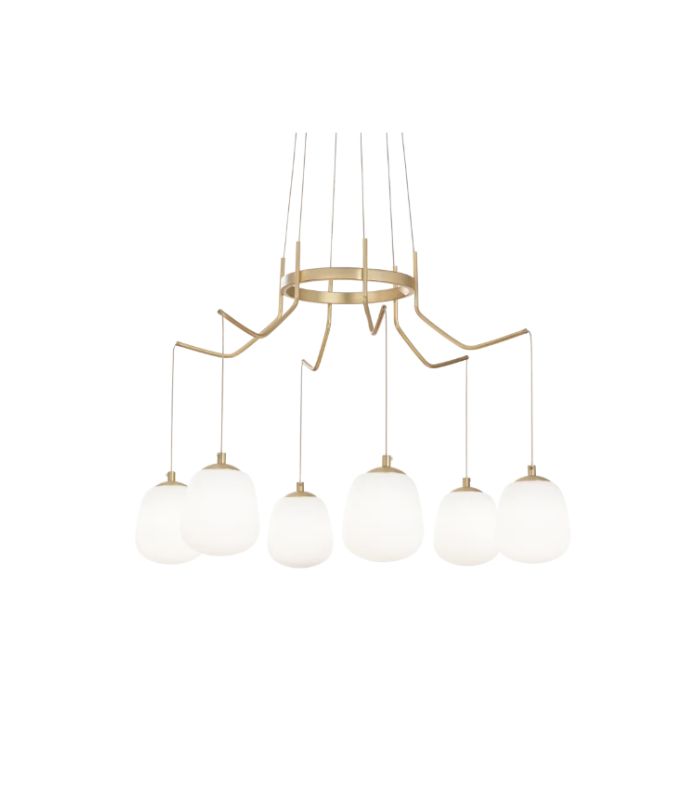 Karousel SP6 este o lustră suspendată modernă, cu structură metalică finisată în alamă satinată și difuzoare din sticlă suflată cu strat acid — concepută pentru a conferi rafinament și lumină difuză spațiilor interioare.