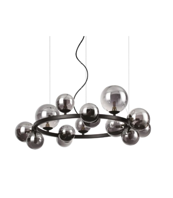 Lustră suspendată Ideal Lux Perlage SP14 — diametru 85 cm, 14 × G9, structură metalică + globuri din sticlă suflată, înălțime reglabilă 55–230 cm, ideală pentru living, dining sau spații mari.