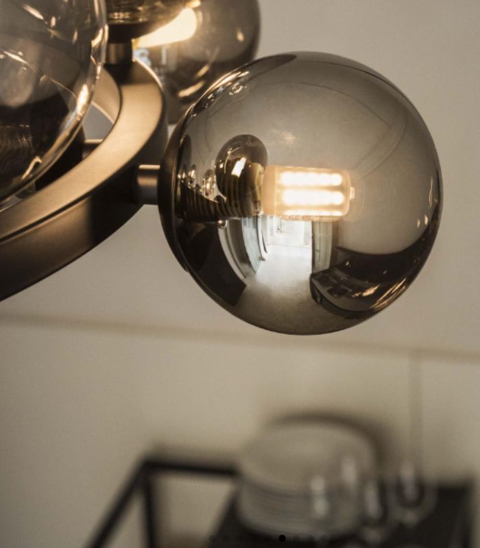 Designul său rafinat — cu structură metalică și globuri de sticlă ambră (sau variante de finisaj) — adaugă un aer sofisticat interiorului, adaptându-se atât decorurilor moderne, cât și celor clasice contemporane. Înălțimea este reglabilă, între aproximativ 55 cm și 230 cm, permițând montaj flexibil în funcție de înălțimea încăperii.