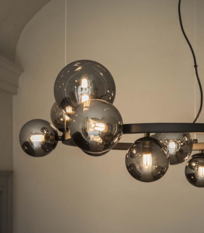 Materialele — metal + sticlă suflată — conferă durabilitate și un aspect premium, iar finisajele disponibile (ex: negru mat cu sticlă fumurie sau structură alamă satinată cu sticlă albă) permit integrarea armonioasă în decoruri moderne sau elegante.