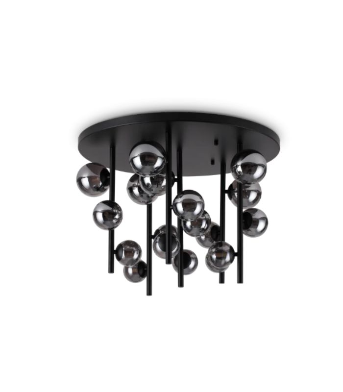 Materialele — metal + sticlă suflată — conferă durabilitate și un aspect premium, iar finisajele disponibile (ex: negru mat cu sticlă fumurie sau structură alamă satinată cu sticlă albă) permit integrarea armonioasă în decoruri moderne sau elegante.