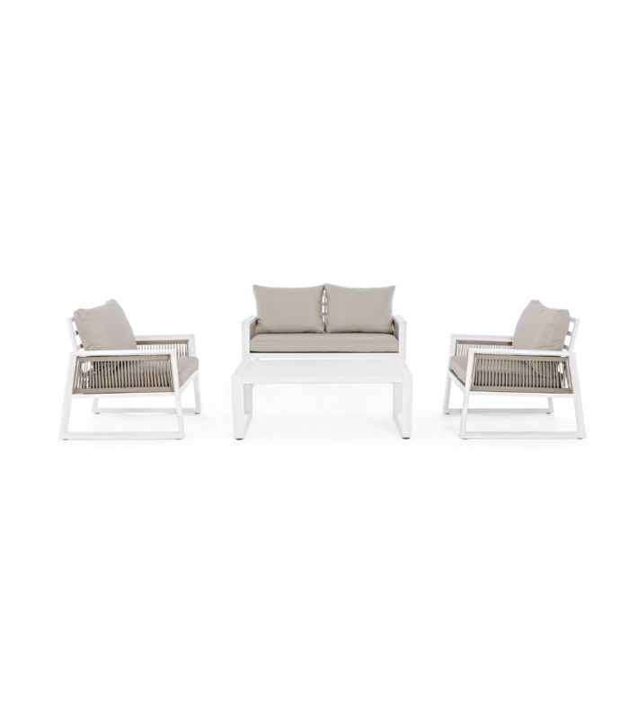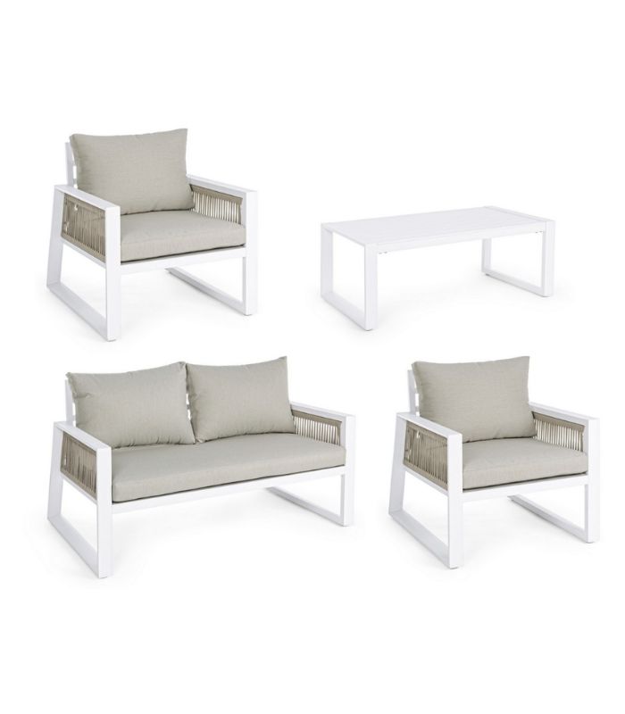 Setul Captiva Bizzotto pentru terasă include canapea, 2 fotolii și masă, oferind un design elegant în nuanțe deschise și confort premium pentru exterior.