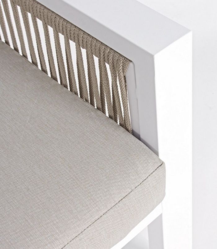 Designul său rafinat se remarcă prin structura solidă, cu finisaj în nuanțe deschise, ce oferă un aspect luminos și sofisticat. Inserțiile laterale cu împletitură decorativă tip rope adaugă textură și un aer contemporan, păstrând în același timp o estetică naturală și relaxantă.
