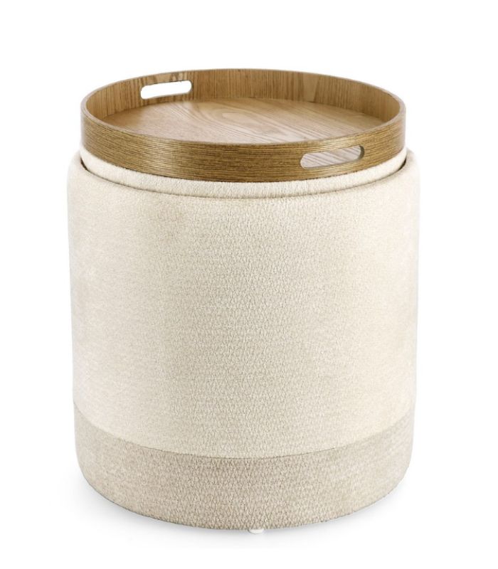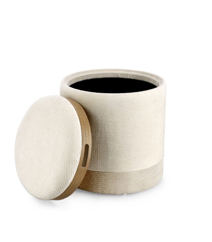 Pouf Deva de la Bizzotto, tapițat în nuanțe elegante natur și gri deschis, cu spațiu de depozitare integrat, ideal pentru living sau dormitor.